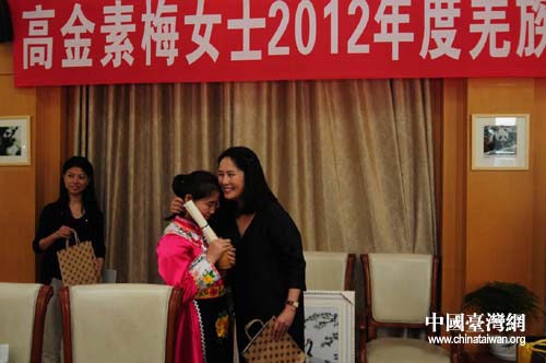 中國臺灣網8月10日成都消息 8月7日至10日,臺灣民意代表高金素梅率臺灣少數民族參訪團赴四川參加“2012年四川世界自然文化遺產之旅”活動,并在成都大熊貓繁育研究基地向其資助的20名北川羌族受災學生發放2012年度助養金74000元,這是她自2008年以來持續第5年資助羌族受災學生,迄今累計金額達34萬余元人民幣。