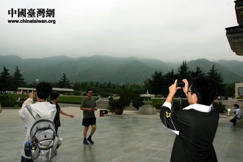 13日早晨,12名臺灣在校大學(xué)生和6名來自北京的大學(xué)生志愿者乘車來到西安市臨潼區(qū)驪山之北,秦始皇帝陵的所在。微微細(xì)雨中,驪山秀美的景色讓人為之精神一震,聽說群山之中有一座埋藏著未曾開挖的秦始皇陵墓,同學(xué)們紛紛舉起相機(jī)拍照留念。