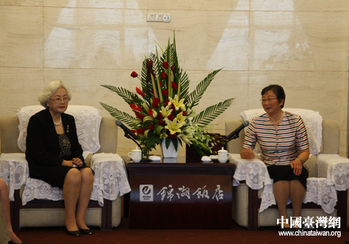 寧夏回族自治區人大副主任、自治區委領導干部聯誼會會長張小素(右)會見了臺灣女企業家協會理事長、臺灣農漁業產銷聯盟發展協會理事長、常富企業集團總裁馬愛珍(左)一行。(中國臺灣網 李瑞艷 攝)