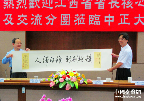中國臺灣網(wǎng)8月24日嘉義消息 8月23日,江西省長鹿心社一行參訪臺灣中正大學(xué),并向臺灣中正大學(xué)贈送加蓋原“中正大學(xué)關(guān)防”的臺灣中正大學(xué)校訓(xùn)書法條幅、原“中正大學(xué)”藏書影印本、兩校友好交往畫冊。中正大學(xué)校長吳志揚向鹿心社贈送“百年樹人碑”及中正大學(xué)出版品。