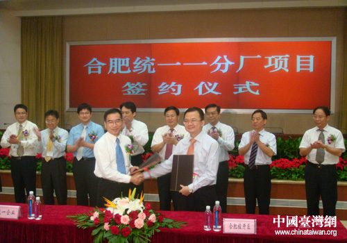 中國(guó)臺(tái)灣網(wǎng)8月24日合肥消息 日前,合肥統(tǒng)一一分廠項(xiàng)目簽約儀式在合肥市政務(wù)中心舉行。安徽省委常委、合肥市委書(shū)記吳存榮出席儀式,并會(huì)見(jiàn)了統(tǒng)一企業(yè)(中國(guó))投資有限公司副董事長(zhǎng)羅智先一行。儀式由市委常委韓冰主持,合肥市市長(zhǎng)張慶軍與羅智先先生分別致辭,統(tǒng)一企業(yè)管理群總經(jīng)理?xiàng)顗壅c經(jīng)開(kāi)區(qū)負(fù)責(zé)人代表雙方簽約。