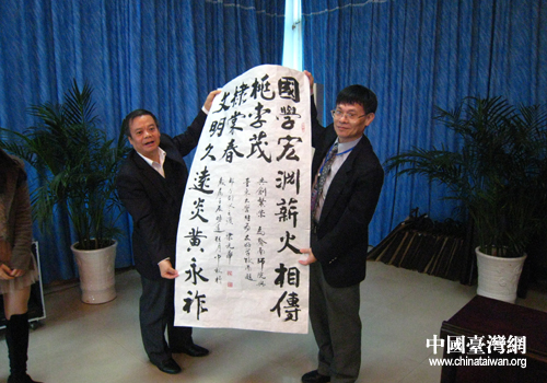 梁光華現場吟誦了他為交流會所作的一幅對聯:國學宏淵薪火相傳桃李茂;文明久遠炎黃永祚棣棠春。并將對聯抒寫成書法作品贈送給臺東大學,表達了對兩岸真情交流,共創繁榮的美好祝愿,贏得在場陣陣熱烈的掌聲。隨后,臺東大學向黔南師院贈送了臺東大學校辦資料,以表達深情厚誼。
