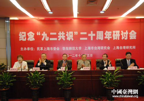 中國臺灣網12月3日上海消息 今天上午,由民革上海市委、上海臺灣研究所、上海市臺灣研究會、華東師范大學交流與區域發展研究所聯合舉辦的紀念“九二共識”二十周年研討會在上海民主黨派大廈舉行。海協會原常務副會長唐樹備、上海市臺辦副主任李雷鳴、華東師范大學副校長范軍、中國國民黨大陸事務委員會主任高輝,以及臺灣前;鶗倍麻L兼秘書長邱進益等出席了會議。