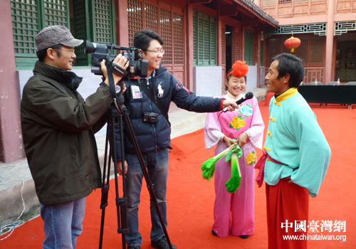 臺灣記者在蚌埠采訪表演花鼓燈的農民。(安徽省臺辦 裔淳 攝)