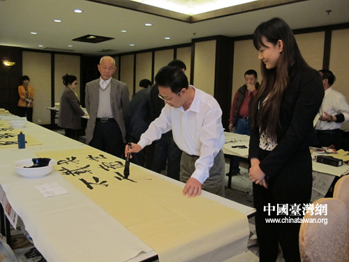 中國臺灣網(wǎng)12月12日廈門消息 12日下午,2012年兩岸青年書畫家作品展組委會在廈門日月谷度假村舉行書畫筆會,兩岸20位書法家現(xiàn)場揮毫潑墨,交流書畫技藝,文氣盎然,其樂融融。(《兩岸關(guān)系》雜志記者 陸東紅 丁宇)