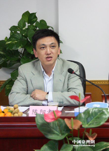 廈門市港口管理局政策法規處處長陳陽都向記者介紹廈門市建設東南國際航運中心的相關情況。(中國臺灣網 扶海濤 攝)