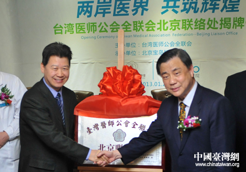 中國臺灣網1月28日北京消息 今天上午,臺灣醫師公會北京聯絡處在北京寶島婦產醫院揭牌,這是臺灣醫師公會在大陸成立的首家聯絡處,標志著兩岸醫界交流與合作邁入了一個全新的階段。衛生部港澳臺辦副主任王立基、衛生部港澳臺辦處長李維、中國醫師協會副會長陸君、中華醫學會副會長吳明江、北京市海淀區衛生局局長段安安和臺灣醫師公會理事長李明濱、北京寶島婦產醫院董事長楊文秀、院長余堅忍等兩岸嘉賓出席揭牌儀式。