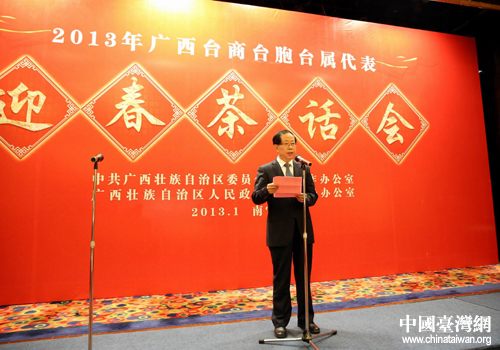 中國臺灣網1月29日南寧消息 1月28日,2013年廣西臺商臺胞臺屬代表迎春茶話會在南寧召開。有關部門代表與全區臺商臺胞臺屬代表歡聚一堂,回顧2012年廣西-臺灣經貿文化全面交流成果,喜迎新春,共敘友誼,共謀發展。