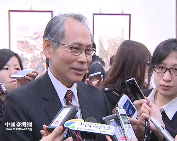 臺灣文化會館基金會執(zhí)行長蘇進(jìn)強(qiáng)在畫展開幕式上接受媒體采訪(中國臺灣網(wǎng) 董憲超 攝)
