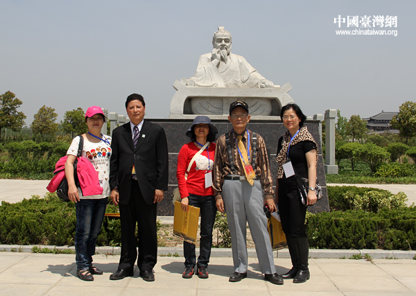 來自臺灣媒體的黃姓記者在先祖春申君黃歇雕像前合影留念。(中國臺灣網(wǎng) 普燕攝)