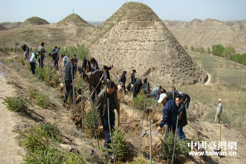 臺(tái)商臺(tái)生在甘肅“隴臺(tái)親情林”開展植樹活動(dòng)。(甘肅省臺(tái)辦 李紅 攝)