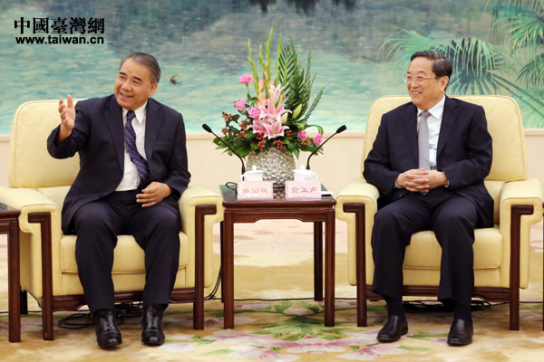 中共中央政治局常委、全國政協主席俞正聲21日上午在北京人民大會堂臺灣廳會見了臺灣少數民族民意代表團一行。(中國臺灣網 于斯文 攝)