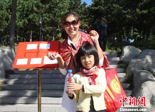 2日上午,威海劉公島國家森林公園主任王建松在臺(tái)贈(zèng)大陸動(dòng)物族譜上填上“天天”的名字。工作人員還準(zhǔn)備了雞蛋、花生等禮品,分發(fā)給現(xiàn)場游客,慶祝小鹿?jié)M月。