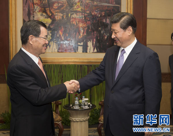 10月6日,中共中央總書記習(xí)近平在印度尼西亞巴厘島會(huì)見臺(tái)灣兩岸共同市場(chǎng)基金會(huì)榮譽(yù)董事長(zhǎng)蕭萬長(zhǎng)一行。 新華社記者蘭紅光攝