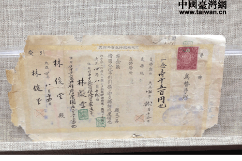 臺灣文物收藏家郭雙富先生捐贈的林獻堂給林癡仙的支票。(中國臺灣網 吳知音 攝)