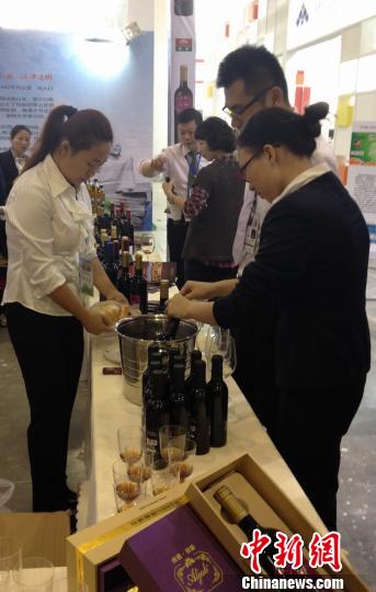 西班牙參展企業工作人員向顧客介紹紅酒!◆斠恪z