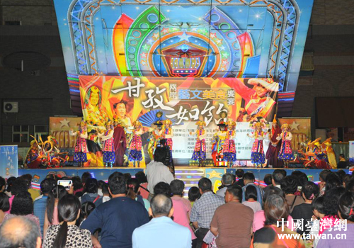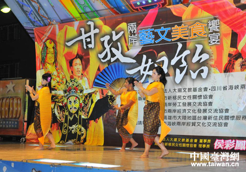 中國臺灣網11月13日高雄消息 日前,四川省民族歌舞赴臺交流團第二場演出在臺灣高雄市三民區義民廟前的空地如約舉行。本場演出除了四川民族歌舞團帶去的節目之外,臺灣同胞也上臺進行了聲樂演奏、舞蹈等表演,兩岸同胞同樂。而演出場地一圈,還有數十個臺灣美食大排檔,當地市民除了可以欣賞文藝表演,也還可以品嘗到當地美食。