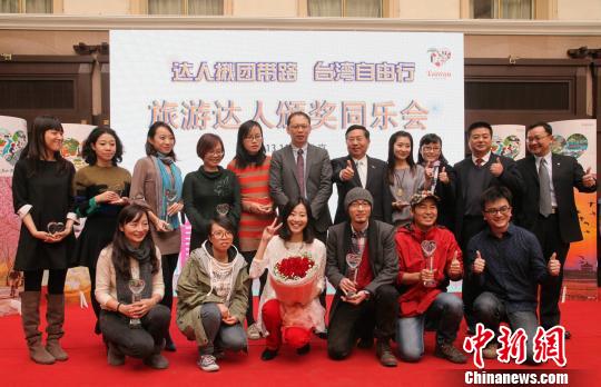 11月16日,臺旅會北京辦事處在北京舉辦“旅游達人頒獎同樂會”。圖為部分旅游達人和與會嘉賓合影。