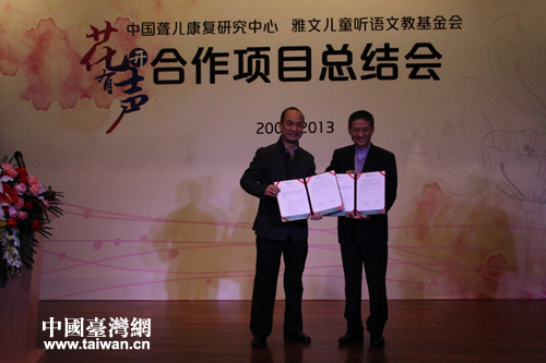中國聾兒康復(fù)研究中心主任胡向陽和明門集團(tuán)董事長、雅文兒童聽語文教基金會(huì)主席鄭欽明交換了下一個(gè)五年《中文聽覺口語師資培訓(xùn)項(xiàng)目合作協(xié)議》。(中國臺(tái)灣網(wǎng) 王怡然 攝)