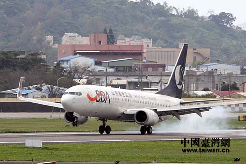 山航濟南-花蓮直航班機在臺灣花蓮機場降落。(圖片來源:山東省臺辦)