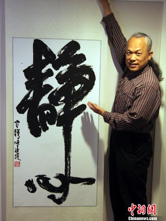 臺灣著名微雕家陳逢顯以一幅書法“靜心”參展。他說,臺灣社會近期有些浮躁之氣,故揮毫寫了“靜心”兩字參展。陳逢顯除精于微雕藝術外,在書法、素描、油畫、雕刻、捏塑陶瓷等也都有修為。近10年來更不遺余力,積極促進兩岸書法藝文界之間的文化交流。他的毫芒雕刻館,也常成為大陸書家來臺的參訪之地。