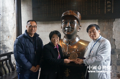 參訪團(tuán)成員與李友邦將軍雕像合影。(中國臺灣網(wǎng)發(fā))