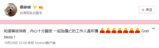 蔡依林29日晚通過認證微博回應稱,獲悉南寧演唱會舞臺搭建現(xiàn)場發(fā)生事故很難過,并為傷亡工作人員祈禱。