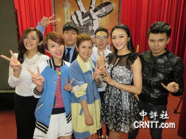 “2015中國好聲音,臺灣校園行”音樂會,陳冰、譚軒轅、江源東、李文豪等大陸歌手,以及舞思愛、晨悠組合(郭惟晨、吳以悠)等臺灣歌手興奮合影。陳冰(右二)說,臺灣好吃的美味,多到數不完。(中評社 吳政峯攝)
