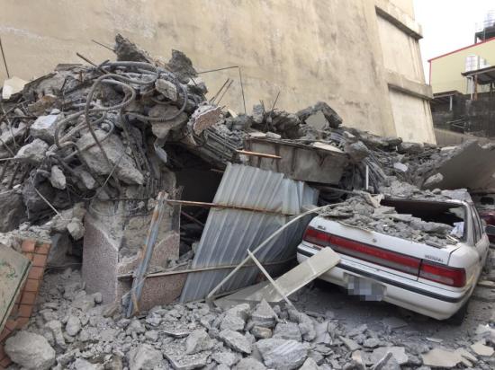 2月6日臺灣南部地區發生6.7級地震,高雄市區部分停在樓下的私家車被掉落的水泥建筑壓毀。中央社記者 郭日曉 攝 圖片來源:中央社