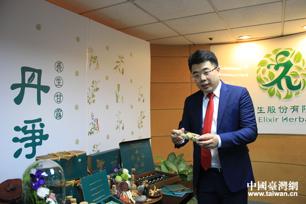 在2016天津臺灣名品博覽會即將舉行之際,“尋跡臺灣名品”媒體采訪團于6月14日至19日走進臺灣,探訪臺灣名品企業。圖為臺灣鈞生股份有限公司董事總經理趙國鈞介紹該公司生產的養生產品。(中國臺灣網 扶海濤 攝)