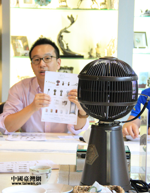 在2016天津臺灣名品博覽會即將舉行之際,“尋跡臺灣名品”媒體采訪團于6月14日至19日走進臺灣,探訪臺灣名品企業。圖為美砌國際企業有限公司負責人許家祥介紹該公司新設計的桌上型電風扇。