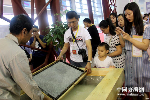 第六屆江蘇書展上的文化推廣活動(dòng)——現(xiàn)場(chǎng)古法造紙演示。(中國(guó)臺(tái)灣網(wǎng)記者 李杰 攝)