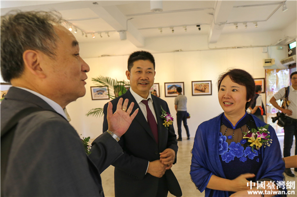 臺灣攝影家交流協(xié)會理事長林再生(左)、寧夏回族自治區(qū)攝影家協(xié)會名譽(yù)主席彭生選(中)與中國臺灣網(wǎng)總經(jīng)理兼海峽兩岸互聯(lián)網(wǎng)交流委員會秘書長劉曉輝(右)觀展(中國臺灣網(wǎng) 李岳 攝)