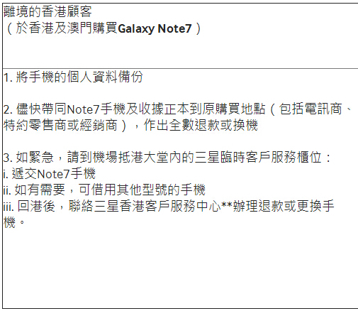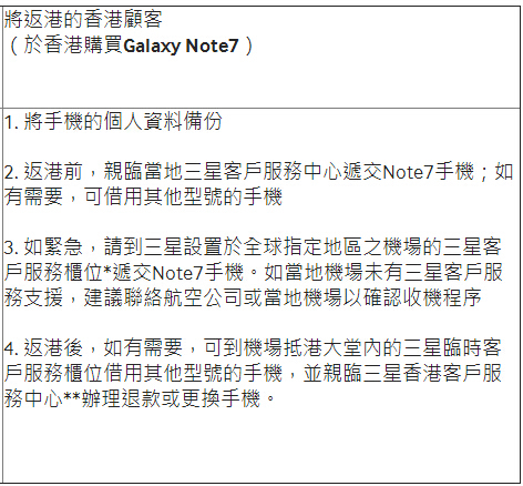 香港三星表示,對于香港民航處最近要求乘客不要于來往香港的航班上攜帶Galaxy Note7,三星電子香港已經(jīng)采取應(yīng)對措施,于香港國際機場設(shè)立客戶服務(wù)柜位,為所有香港及身處香港的Galaxy Note7外國顧客提供緊急協(xié)助。所有Galaxy Note7的顧客在登機前,應(yīng)將手機交予當?shù)氐娜强蛻舴⻊?wù)中心,或當?shù)貦C場內(nèi)的三星客戶服務(wù)柜位、航空公司或機場保安,并從他們獲取證明文件,在返回原居地后,以便三星協(xié)助跟進。