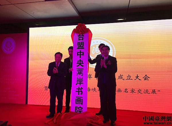 臺盟中央常務副主席黃志賢(右一)與臺盟中央兩岸書畫院院長梁國揚(左一)為臺盟中央兩岸書畫院揭牌。(中國臺灣網 齊昕 攝)