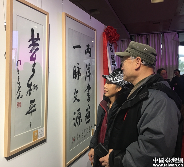 嘉賓為連戰、吳伯雄、朱立倫等人所贈書法作品拍照留念。(中國臺灣網 齊昕 攝)