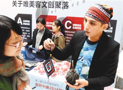 近日,福州舉辦第二屆三坊七巷文創(chuàng)節(jié)暨2016福建手作之美大展。圖為臺灣青年周世豪(右一)也來“練攤”,展示臺灣少數(shù)民族的文創(chuàng)藝術(shù)品。劉可耕攝