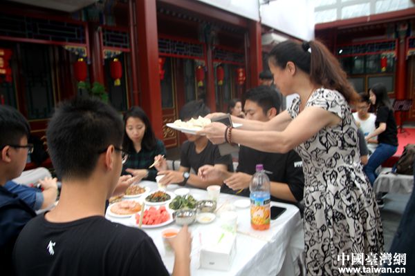 好客的北京社區(qū)居民包了四種餡的餃子歡迎客人,請來了剪紙、糖人、面人、京劇臉譜等非物質(zhì)文化遺產(chǎn)傳承人與兩岸青年互動體驗,一同制作具有北京特色的紀(jì)念品,并和兩岸青年一起聯(lián)歡表演文藝節(jié)目,最后,臺灣大學(xué)生幾人一組,到社區(qū)居民家中做客,了解胡同文化,進行互動交流。