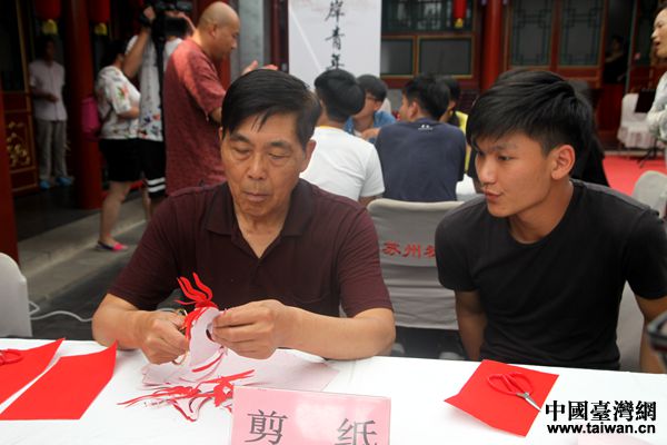 臺灣大學(xué)生向非物質(zhì)文化遺產(chǎn)傳承人學(xué)習(xí)剪紙。(中國臺灣網(wǎng) 李杰 攝)
