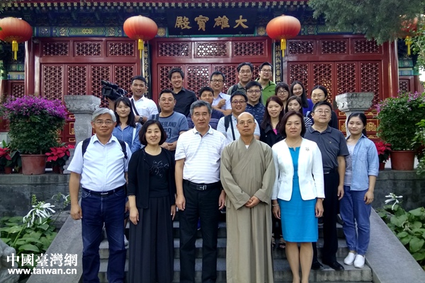 《北京法源寺》參會人員與寺內法師殿前合影。(中國臺灣網發 北京市臺辦提供)