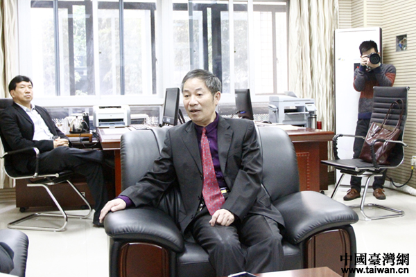 在福州市臺胞權(quán)益保障法官工作室,臺商鄭德汐向記者介紹情況。(中國臺灣網(wǎng) 王怡然 攝)