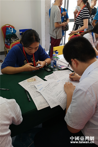 為了讓更多學生體驗移動支付,今年組委會邀請中國移動公司、海峽銀行工作人員在營地聯合辦公,便捷臺青開通移動支付;谵k理人數激增,中國移動公司和海峽銀行工作人員10日也增添了1組工作人員,以便快速幫助臺青辦理移動支付。
