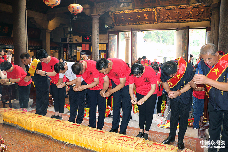 湄洲媽祖祖廟廟方代表陪同長島顯應宮媽祖金身護送團代表向祖廟媽祖進香。(中國臺灣網 何建峰 攝)
