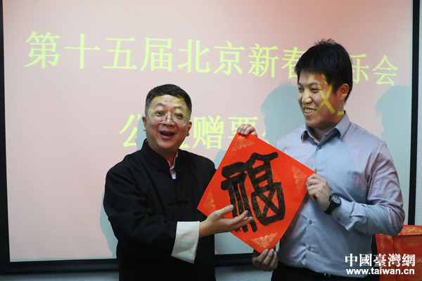 書法家向在京臺胞贈送“福”字。(中國臺灣網 汪明珠 攝)