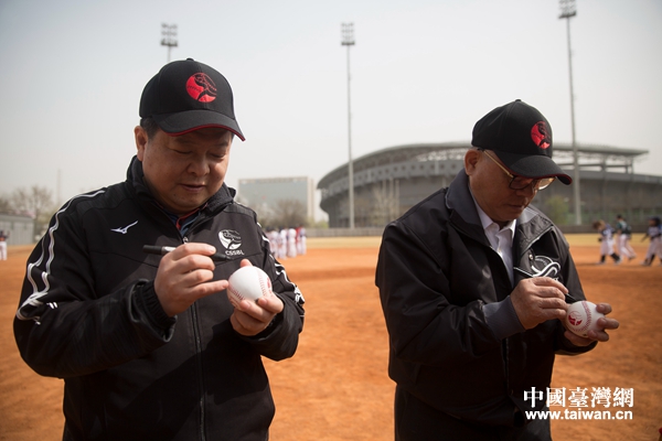 國臺辦副主任龍明彪、海峽兩岸棒球交流合作委員會名譽主席彭誠浩在棒球上簽名(中國臺灣網發 主辦方供圖)