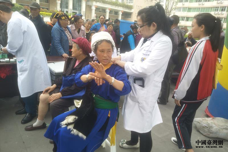 4月26日下午,義診活動在茂縣政府廣場舉行,有分別來自上海瑞東醫院、北京協和醫院、復旦大學醫學院、蘇州慈濟醫院等全國多地醫院的11名臺胞醫療專家,提供了以中醫為主的健康咨詢服務。這支由6位醫學博士、3位醫學碩士、2位醫學學士組成的高層次醫療團隊吸引近百名群眾前來咨詢就診,活動現場人頭攢動,氣氛熱烈。專家們仔細診斷、耐心解答,同時還為前來咨詢的群眾檢查身體、做中醫針灸和推拿按摩,指導他們做好日常生活中的疾病預防和及時治療。專家們精湛的醫術、認真負責的態度以及耐心細致的工作作風,贏得當地百姓的一致好評。