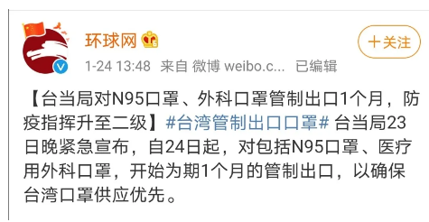 其二,就在今年1月底新冠肺炎疫情爆發(fā)之時,臺當局公告自1月24日起至2月23日止,為期1個月的期間,“紡織材料制口罩,過濾效果94%及以上者”(即N95口罩)及“其他紡織材料制口罩”管制出口。之后,在此前為期1個月的“口罩出口禁令”還未結束時,臺“經濟部”就已于2月13日宣布將禁令再度延長至4月底。