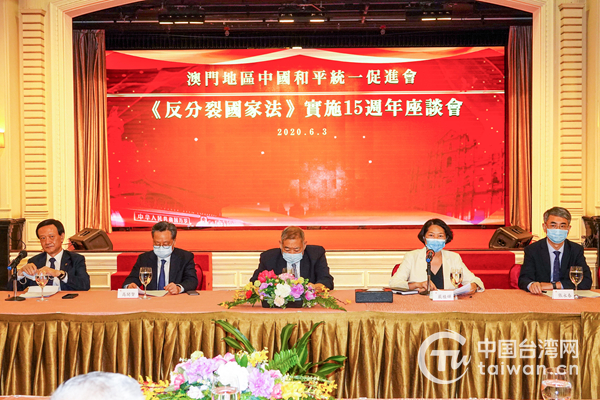 中國臺灣網6月3日澳門訊 6月3日下午,澳門地區中國和平統一促進會舉行《反分裂國家法》實施15周年座談會。中央人民政府駐澳門特別行政區聯絡辦公室副主任嚴植嬋、澳門立法會主席高開賢、澳門特區政府行政法務司司長張永春、部分澳區全國人大代表、中國和平統一促進會理事等共同出席座談會。澳門和統會理事會會長劉藝良主持座談會。