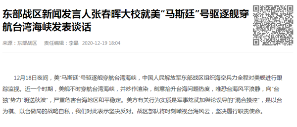 東部戰區新聞發言人張春暉大校19日就美“馬斯廷”號驅逐艦穿航臺灣海峽發表談話。