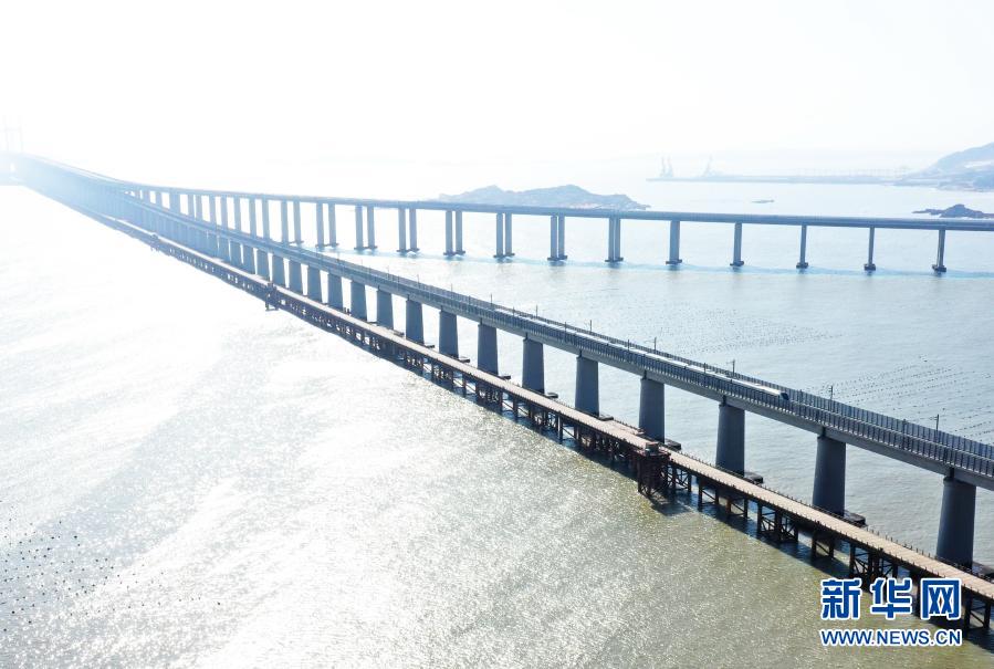 26日,當首發列車駛上這座大橋時,乘客紛紛舉起手機拍照留念。當日風力超過6級,但高速行駛的列車依然平穩舒適。